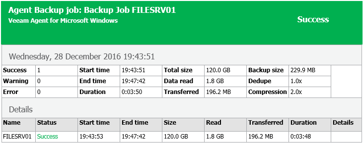 You can receive email notifications with Veeam Agent for Microsoft Windows job results. When the backup job session completes, Veeam Agent for Microsoft Windows will send a report containing data on the job session to the specified email address.