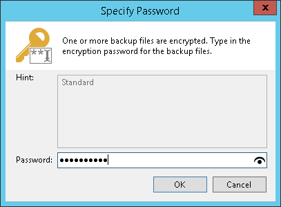 - Veeam Agent for Microsoft Windows will display the Specify Password window. In the Hint field of the Specify Password window, Veeam Agent for Microsoft Windows displays a hint for the password that was used to encrypt the backup file. Use the hint to recall the password.