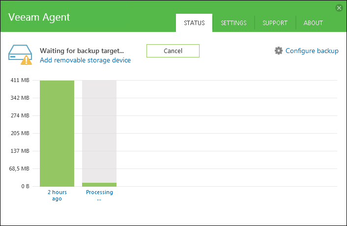 If you do not register the newly connected drive before the backup job starts, Veeam Agent for Microsoft Windows will be unable to detect the backup target and launch the backup job. Veeam Agent for Microsoft Windows will display a warning in the system tray and in the Control Panel. To register a new device, click the Add removable storage device link in the Status view of the Control Panel and register the newly connected drive as described above.