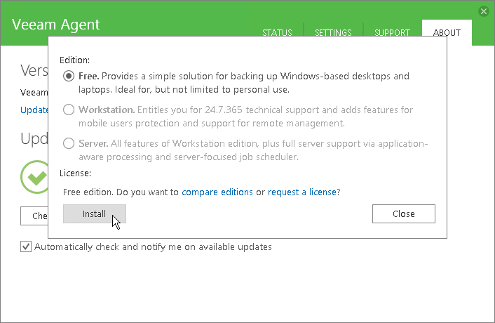 Veeam Agent for Microsoft Windows will install the license and select the product edition that is allowed by the license. If a license supports both the Workstation and Server editions, Veeam Agent for Microsoft Windows will select the product edition based on the type of the Microsoft Windows OS installed on the Veeam Agent computer.