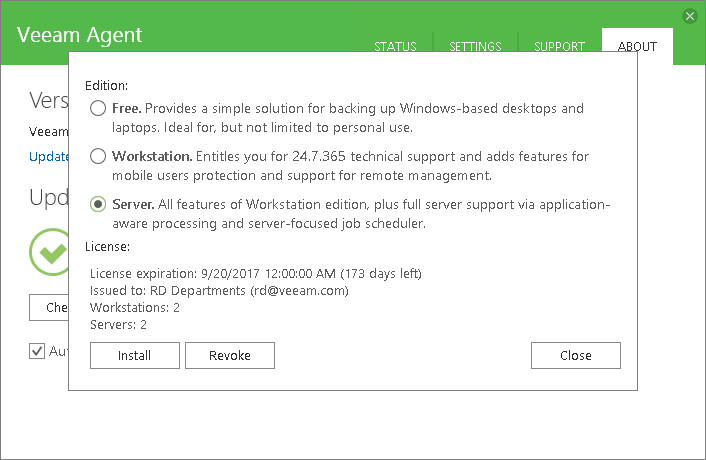 When you install a license, Veeam Agent for Microsoft Windows automatically selects the product edition that is allowed by the license. If a license supports both the Workstation and Server editions, Veeam Agent for Microsoft Windows will select the product edition based on the type of the Microsoft Windows OS installed on the Veeam Agent computer.