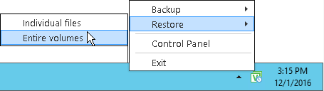 - Right-click the Veeam Agent for Microsoft Windows icon in the system tray and select Restore > Entire volumes.