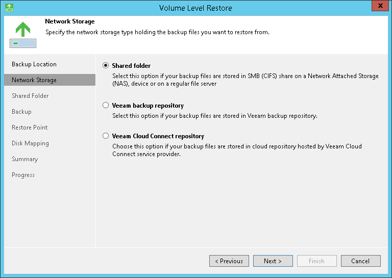 - Shared folder — select this option if the backup file resides in a network shared folder. With this option selected, you will pass to the Shared Folder step of the wizard.
