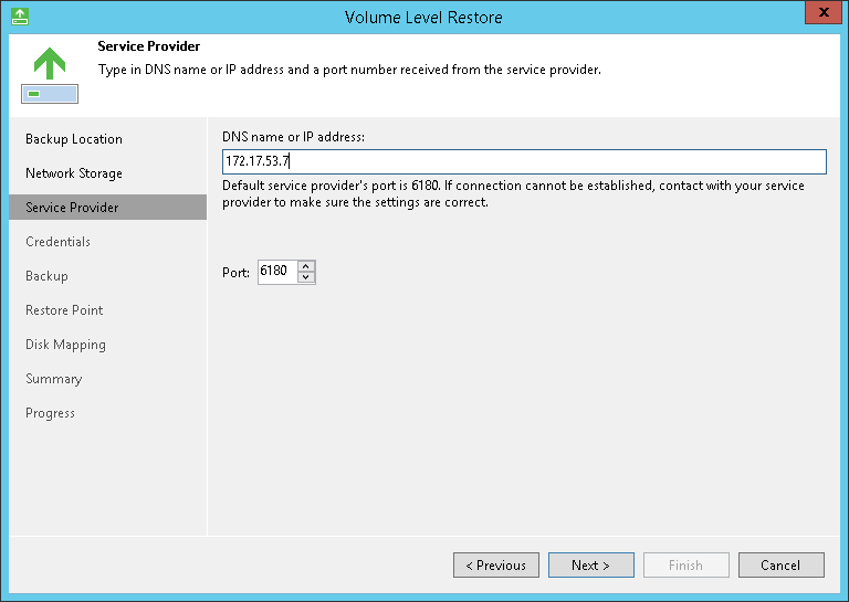 The Service provider step of the wizard is available if you have chosen to restore data from a cloud repository exposed to you by a Veeam Cloud Connect service provider.