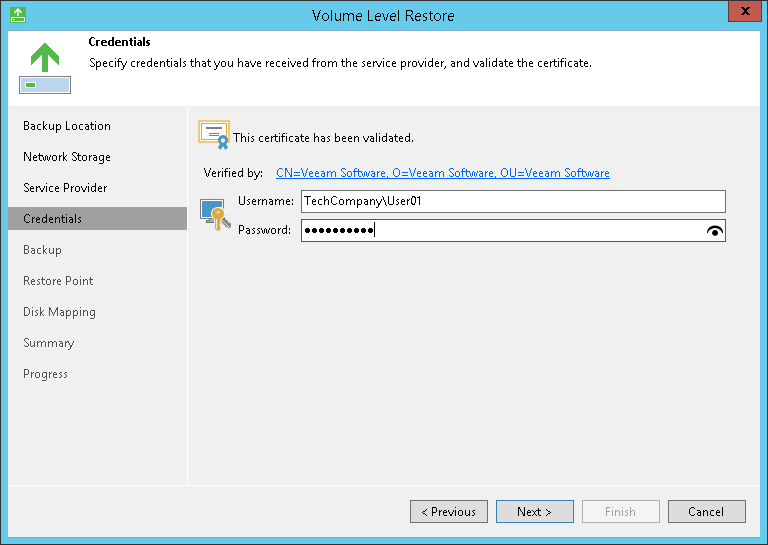 The Credentials step of the wizard is available if you have chosen to restore data from a cloud repository and specified settings for the cloud gateway.