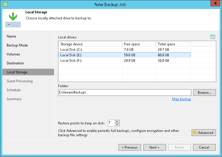 The Local Storage step of the wizard is available if you have chosen to save the backup on a local drive of your computer.