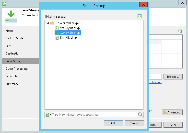 - In the Folder field, specify the same path as was specified in the Folder field for the job that was used to create the backup.