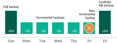 - Every next job session creates a new incremental restore point starting from the synthetic full backup until the day on which synthetic full backup is scheduled. On this day, Veeam Agent for Microsoft Windows creates a new synthetic full backup.