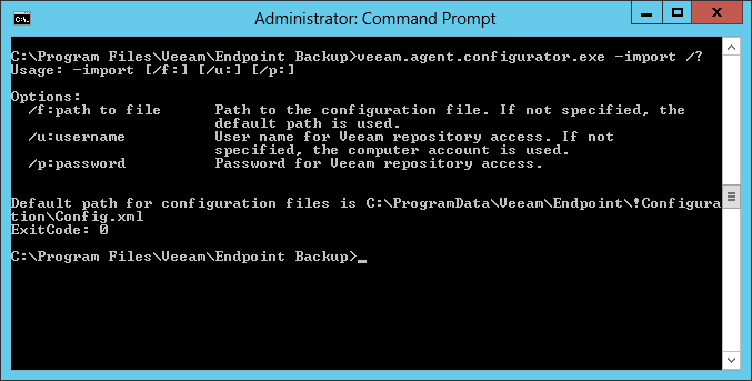 For example, the Veeam.Agent.Configurator.exe -import /? command displays information about the -import command in the command prompt.