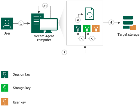 - Veeam Agent for Microsoft Windows creates a session key and a metakey. The metakey is stored to the Veeam Agent for Microsoft Windows database.
