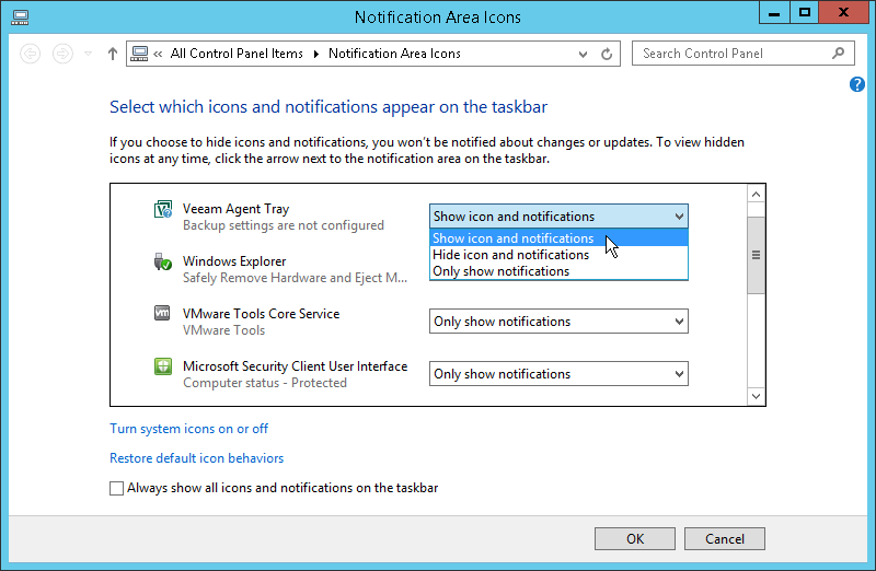 - In the Notification Area Icons window, find Veeam Agent Tray.