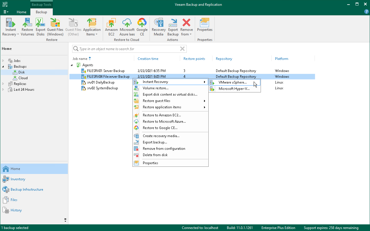 You can use the Veeam Backup & Replication console to restore a Veeam Agent computer as a VMware vSphere VM in your virtualization environment. For Instant Recovery to a VMware vSphere VM, you can use Veeam Agent backups created on the Veeam backup repository. You cannot perform this operation with Veeam Agent backups created on the Veeam Cloud Connect repository.