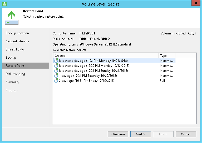 By default, Veeam Agent for Microsoft Windows uses the latest restore point. However, you can select any valid restore point to recover volumes to a specific point in time.