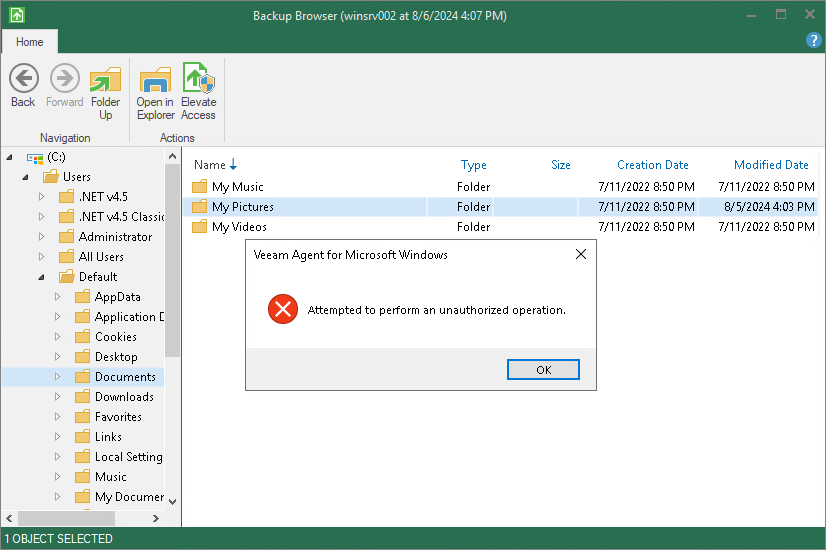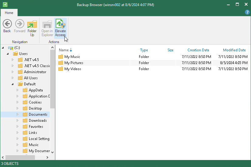 - In the Veeam Backup browser, click Elevate Access on the toolbar.