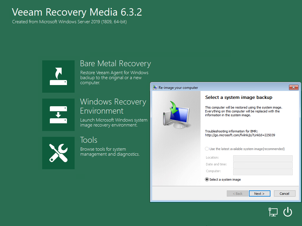 To access the Microsoft Windows System Image Recovery tool, on the Veeam Recovery Media screen, click Windows Recovery Environment.
