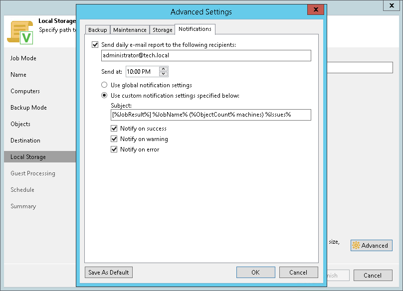 - To receive a typical notification for the backup policy, select Use global notification settings. In this case, Veeam Backup & Replication will apply to the backup policy global email notification settings specified for the backup server.