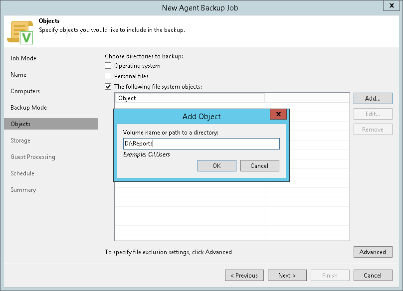 - In the Add Object window, type the path to a folder, mount point folder, or volume that you want to back up, for example, D:\Reports or D:\, and click OK.
