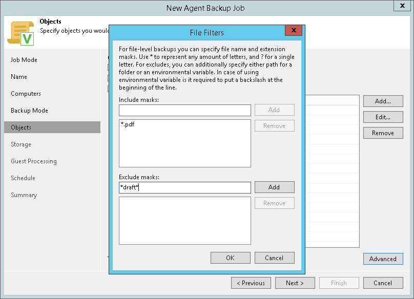 - If you include a specific folder in the file-level backup, in the Include masks field, specify file names and/or masks for file types that you want to back up, for example, MyReport.pdf, *filename*, *.docx. The resulting Veeam Agent backup will contain only selected files. Other files will not be backed up.