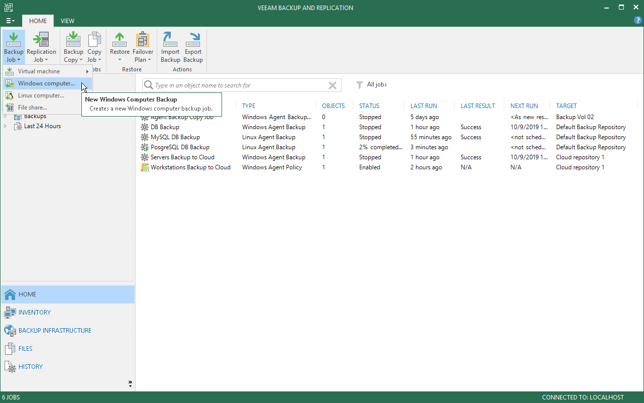 - Open the Home view. Select the Jobs node and click Backup Job > Windows computer on the ribbon.