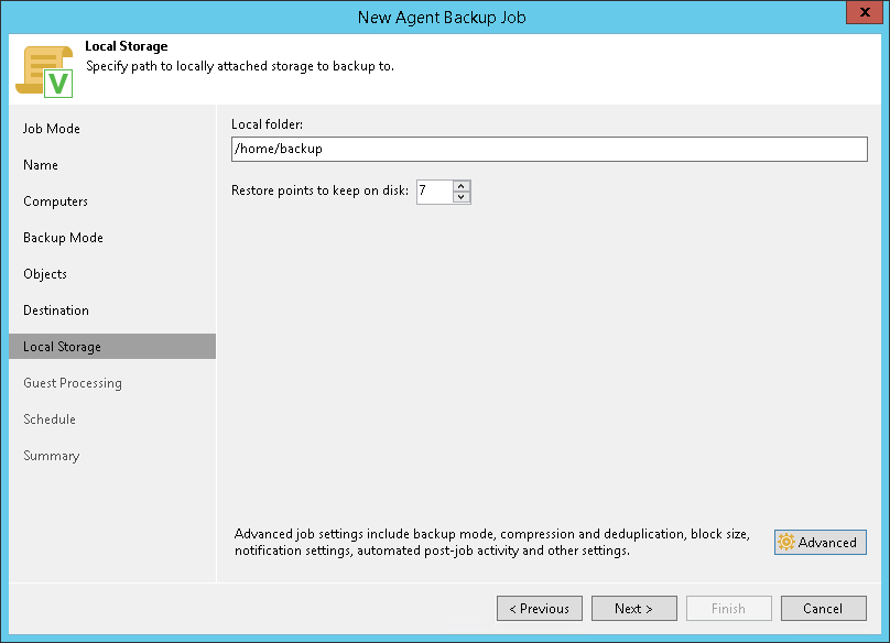 - In the Local folder field, type a path to a folder on a protected computer where backup files must be saved. If the specified folder does not exist in the file system of a protected computer, Veeam Agent for Linux will create this folder and save the resulting backup file to this folder. If the volume on which the specified folder must reside does not exist on a protected computer, Veeam Backup & Replication will not apply the backup job settings to this computer.
