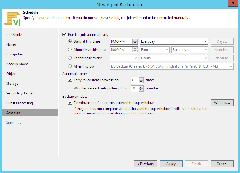 - Select the Terminate job if it exceeds allowed backup window check box and click Window.