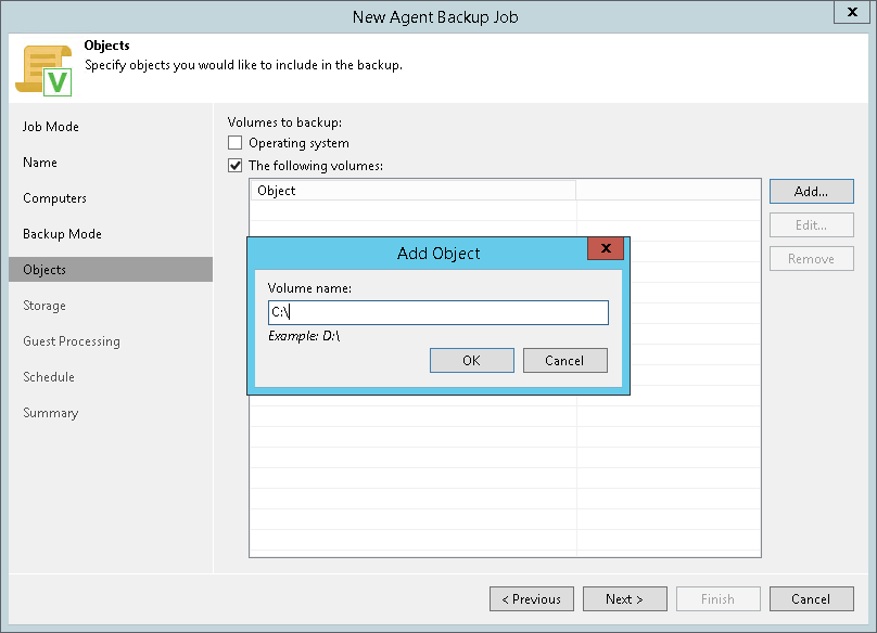 - In the Add Object window, type the drive letter of a volume that you want to back up, for example, C:\, and click OK.