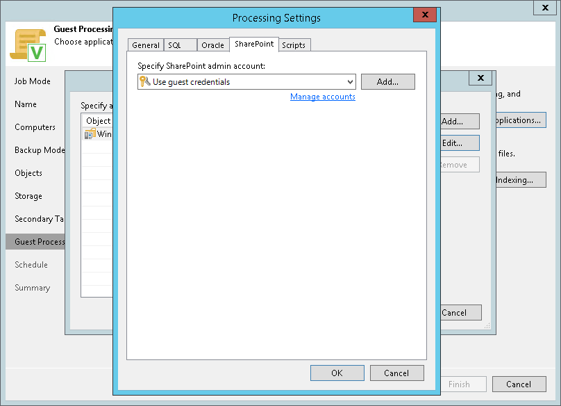 - From the Specify SharePoint admin account list, select a user account that Veeam Agent for Microsoft Windows will use to connect to the SharePoint application. If you have not set up credentials beforehand, click the Manage accounts link or click Add on the right to add credentials.
