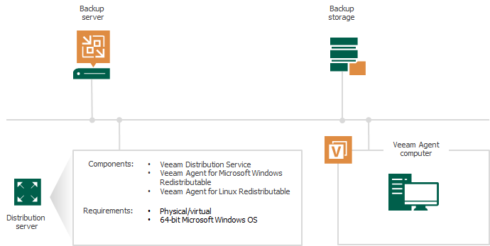 The distribution server is an architecture component in the Veeam Agent management infrastructure used for deployment of Veeam Agent setup files to protected computers. When you instruct Veeam Backup & Replication to install Veeam Agent on a protected computer, the Veeam backup server communicates to the distribution server, and Veeam Backup & Replication uploads Veeam Agent setup file from the distribution server to the target computer.