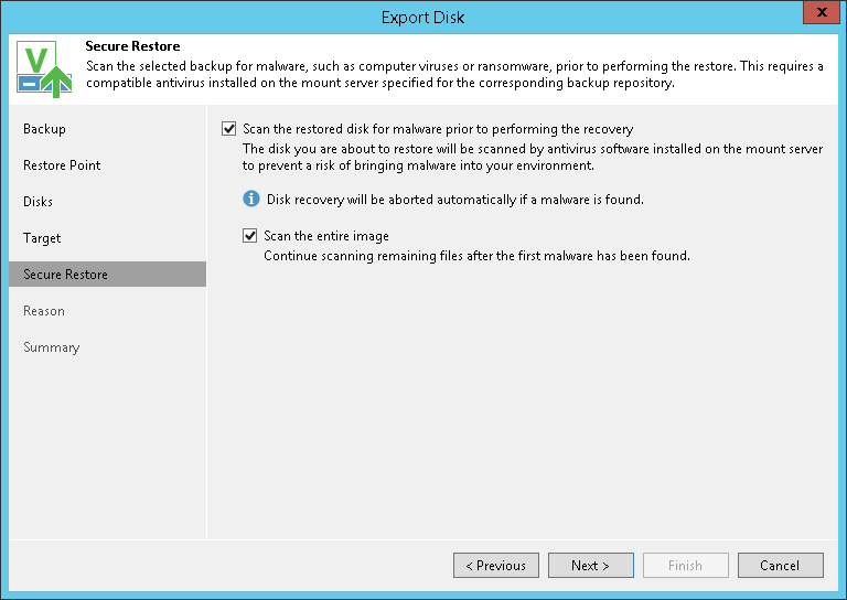 The Secure Restore step of the wizard is available if you export disks from a Veeam Agent backup of a Microsoft Windows machine.