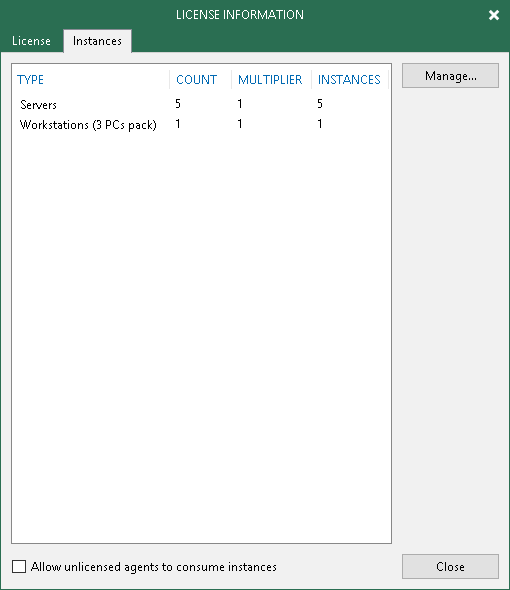 The Veeam Agent management functionality is licensed by the number of instances. Instances are units (or tokens) that you can use to protect your machines (servers and workstations) with Veeam Agent for Microsoft Windows and Veeam Agent for Linux. The number of instances that you can use depends on the type of license installed in Veeam Backup & Replication: