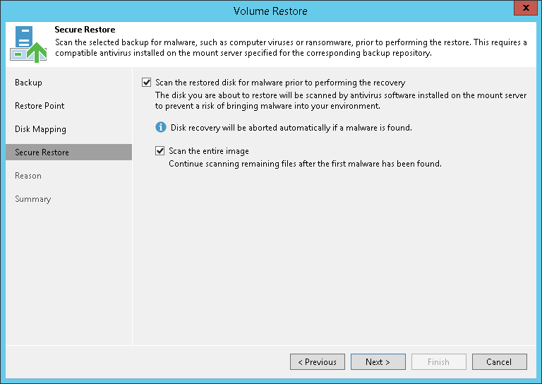At the Secure Restore step of the wizard, you can instruct Veeam Backup & Replication to perform secure restore — scan restored volume data with antivirus software before restoring the volume. To learn more about secure restore, see the Secure Restore section in the Veeam Backup & Replication User Guide.