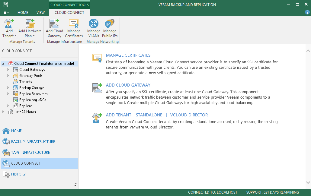 To bring the SP backup server back to the normal operational mode, right-click the Cloud Connect node and select Maintenance mode once again.
