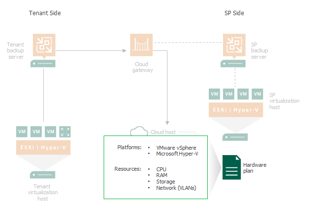 The hardware plan is a set of resources that the SP allocates in their Veeam Cloud Connect infrastructure to set up a target for tenant VM replicas. For a tenant, a hardware plan appears as a cloud host. A tenant can utilize a cloud host as a regular target host to perform VM replication and failover tasks.