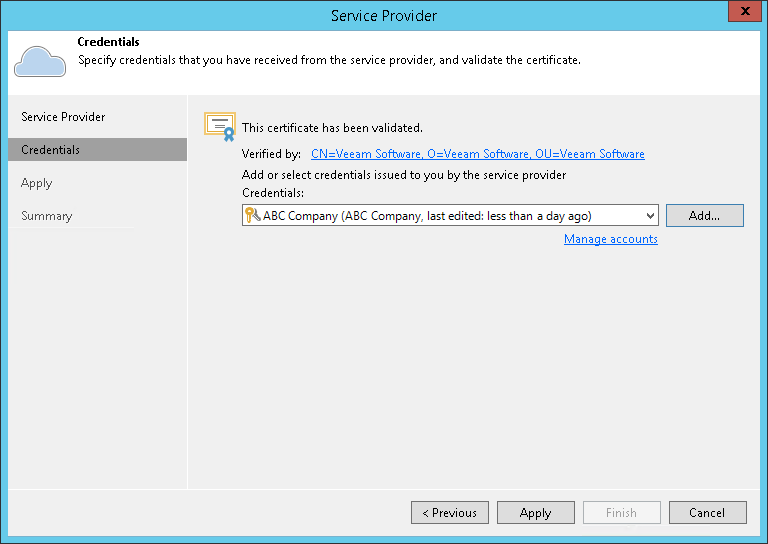 - From the Credentials list, select credentials for the tenant account that the SP has provided to you. If you have not set up credentials beforehand, click the Manage accounts link or click Add on the right to add necessary credentials.