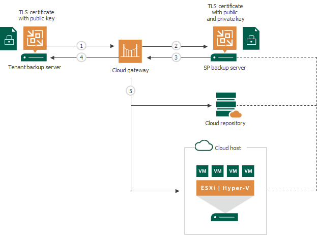 - The SP Veeam backup server exposes a TLS certificate installed on it to tenant Veeam backup server via the cloud gateway.
