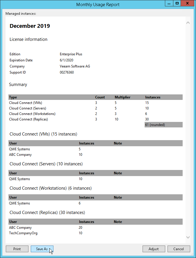 If you perform manual license usage reporting, you must save the license usage report after review for future submission. You can also save the report in case of automatic reporting, for example, to keep a copy of the report in the desired folder. You can choose to save the report to a file in the PDF format or JSON format.