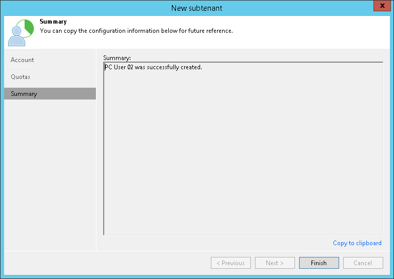 - Click the Copy to clipboard link to copy information about the created subtenant account: user name, password, cloud repository and quota. You must send the copied information to a user on the tenant side so that they can use the created subtenant account to configure a backup job targeted at the cloud repository.