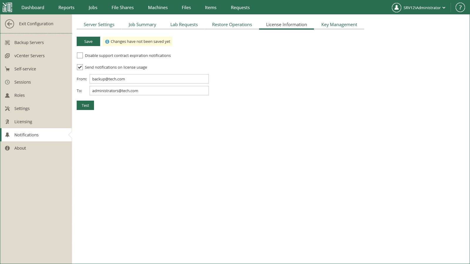 To verify that you have configured email settings correctly, click Test. Veeam Backup Enterprise Manager will send a test email message to all specified email addresses. |