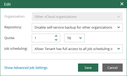 - From the list of repositories, select Disable self-service backup for other organizations.