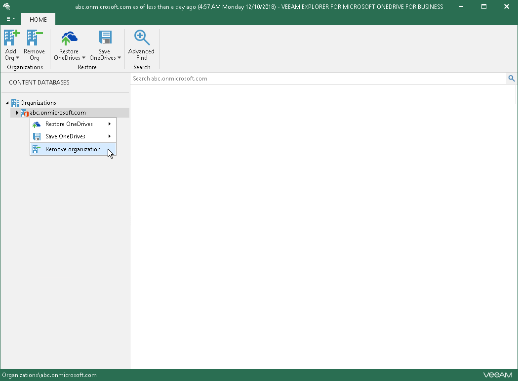 Veeam Explorer for Microsoft OneDrive for Business allows you to remove an organization from the application scope when you no longer need it.