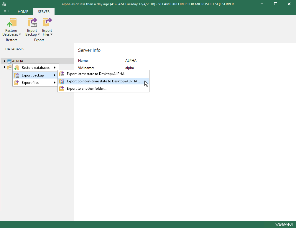 - On the Database (or Server/Instance) tab, select Export Backup > Export point-in-time state to Desktop\<db_name> or right-click a database and select Export Backup > Export point-in-time state to Desktop\<db_name>.