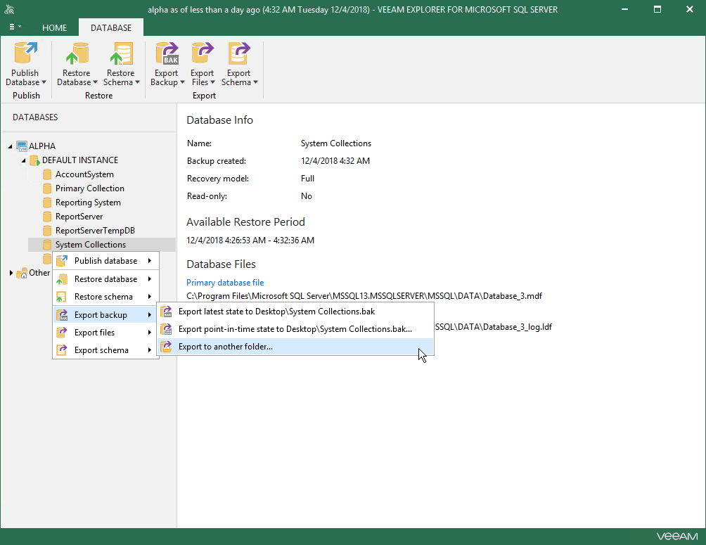 On the Database (or Server/Instance) tab, select Export Backup > Export to another folder or right-click a database and select Export Backup > Export to another folder.