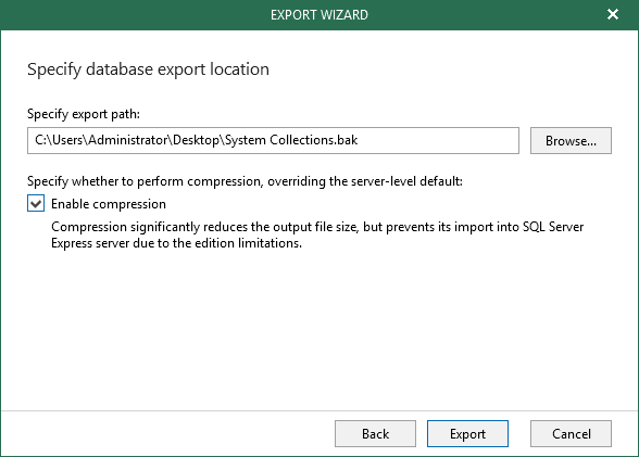 This is an archive version of the document. To get the most up-to-date information, see the current version. Step 3. Specify Database Export Location At this step of the wizard, specify the path to the destination directory.You can select Enable Compression check box to reduce the file size. Note:Compression is unavailable for Microsoft SQL Server 2005 and all Express Editions of Microsoft SQL Server.