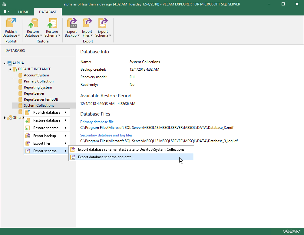 - On the Database (or Server/Instance) tab, select Export Schema > Export database schema and data or right-click a database and select Export Schema > Export database schema and data.