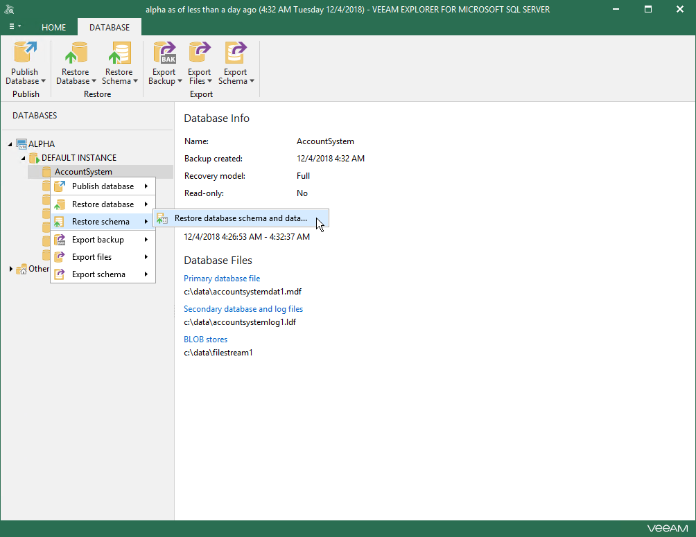 - On the Database tab, select Restore Schema > Restore database schema and data or right-click a database and select Restore schema > Restore database schema and data.