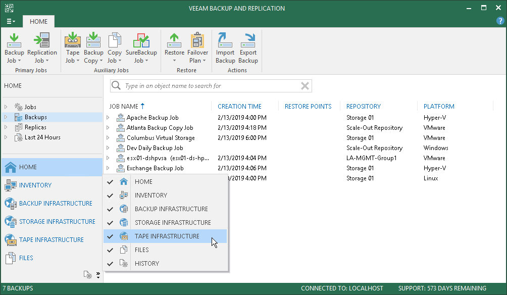 - The Home view is intended for work with jobs. It also displays a list of created backups and replicas that can be used for various restore operations, and provides statistics for recently performed jobs. For more information about job statistics, see Reporting.