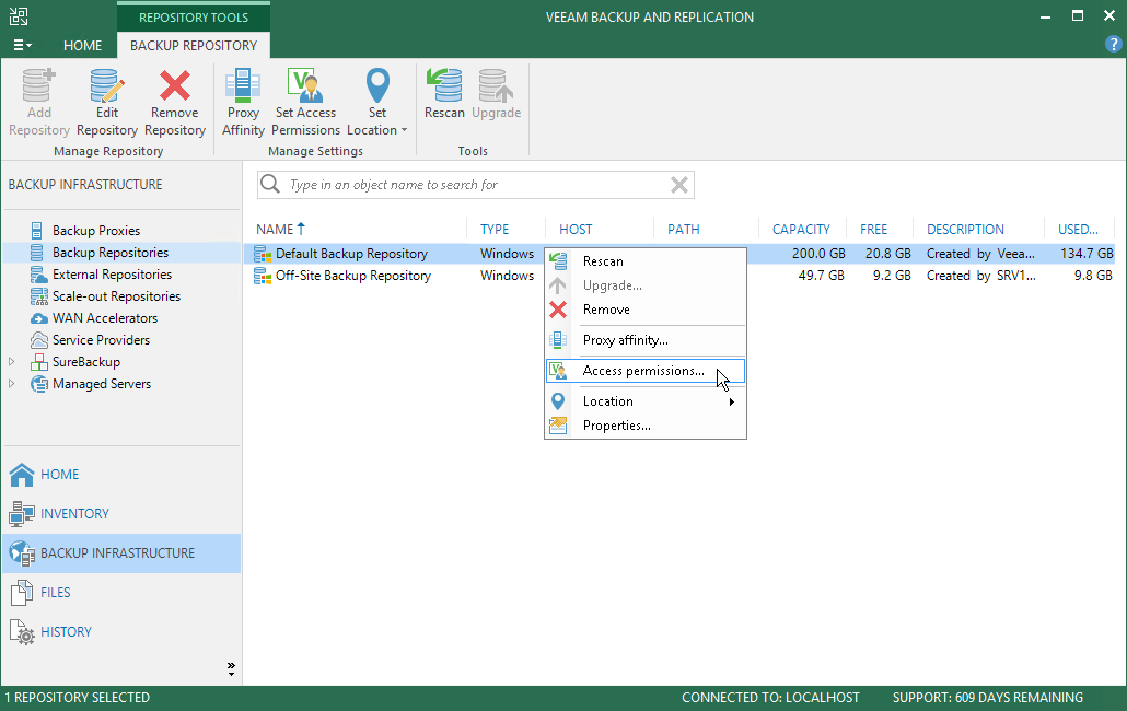 - In the working area, select the necessary backup repository and click Set Access Permissions on the ribbon or right-click the backup repository and select Access permissions. If you do not see the Set Access Permissions button on the ribbon or the Access permissions command is not available in the shortcut menu, press and hold the [CTRL] key, right-click the backup repository and select Access permissions.