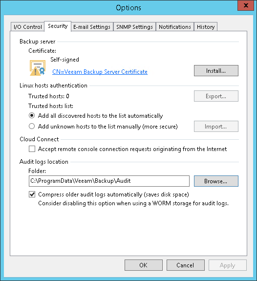 At Audit Logs Location field you can select folder where the audit logs will be stored. By default, log files are stored in the following folder: %ProgramData%\Veeam\Backup\Audit. You can also select a CIFS folder.