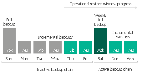 The backup chain on the left becomes inactive after a new full backup file is created and consists of one .vbk file and five .vib files. Since only the first four backup files (represented as grey blocks) in this inactive backup chain exceed the operational restore window, Veeam Backup & Replication removes blocks of data from these four files only and leaves the other two .vib files (created on Thursday and Friday) as they are until the operational restore window moves forward, and so on.