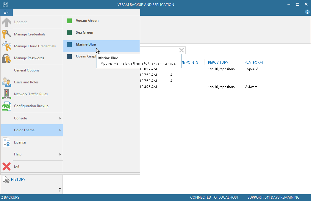 By default, Veeam Backup & Replication uses a ‘Sea Green’ color theme for the UI. If necessary, you can change the color theme. Changing the color theme can be helpful, for example, if you connect to different backup servers from one remote machine on which the Veeam Backup & Replication console is installed. In this case, you will be able to easily differentiate with which backup server you are currently working.